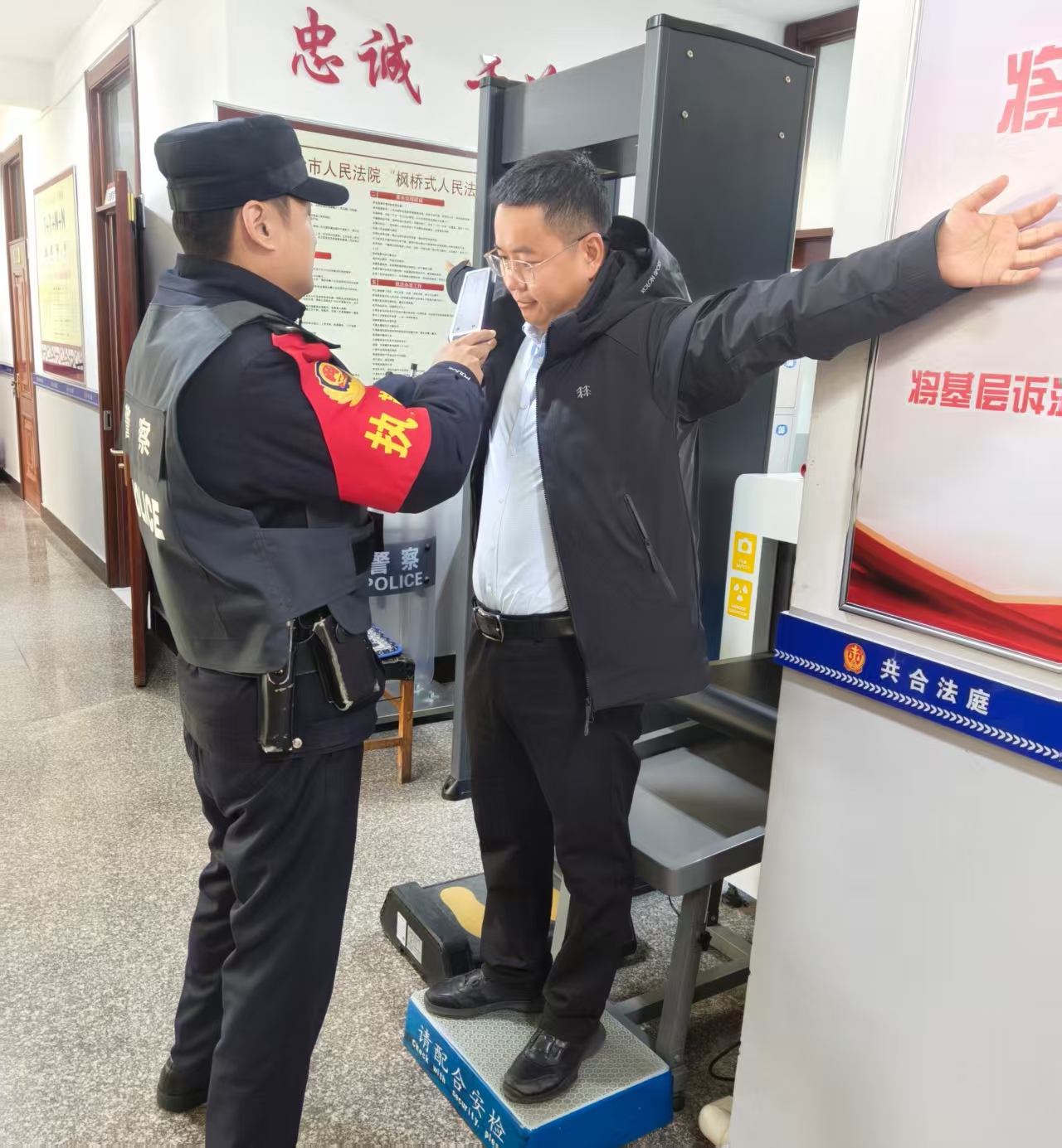 在法庭入口处,镇政府干部们自觉排队,依次接受严格的安全检查。“进入审判场所必须接受安全检查,这是人民法院司法安全的基本要求,既是保护诉讼参与人的安全,也是维护法庭的严肃与权威。”现场执勤的法警向干部们解释道。这看似平常的流程,却让干部们对法院工作的严谨性与规范性有了最直观的“初体验”。