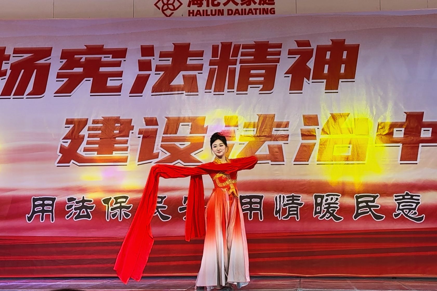 宣传活动结束后,由海伦市政法委统筹组织的“宪法宣传文艺演出”精彩上演,全市各政法单位齐聚一堂,以群众喜闻乐见的艺术形式传递法治正能量。海伦法院政治部干警国安琪带来的舞蹈节目灵动激昂,用舒展的舞姿诠释了“司法为民、公正司法”的初心使命,展现了法院干警刚柔并济的精神风貌;干警邓育彤献上的歌曲演唱深情婉转,以悠扬旋律传递宪法精神的深刻内涵,让现场观众在艺术熏陶中感受法治温度。整场演出紧扣宪法宣传主题,节目形式多样、内容鲜活,将法律知识与文艺表演有机融合,既丰富了群众的精神文化生活,更让宪法精神在潜移默化中深入人心。