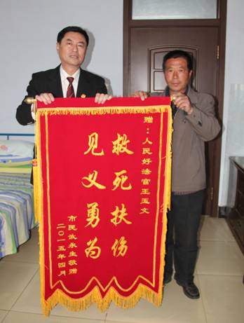此事过后,王玉文再也没有想起。却被武某牢牢记在心里,“我一定要找到这位好心人”。武某向医护人员打听,得知其二人是被法院警车送来医院抢救的,那位好心人好像是姓王。武某来到海伦市人民法院寻找好心人,由于工作规定,法院要对干警个人信息保密,并没有给武某答复。谨代表王玉文谦逊的接受了武某的谢意,并坦诚这是我们应该做的。此后,武某由于生病卧床两年,身体康复后又继续寻找这位无私奉献、不求回报的好法官。