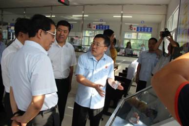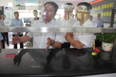 省委政法委书记杨东奇、绥化市委书记张晶川走到立案服务窗口与干警交谈