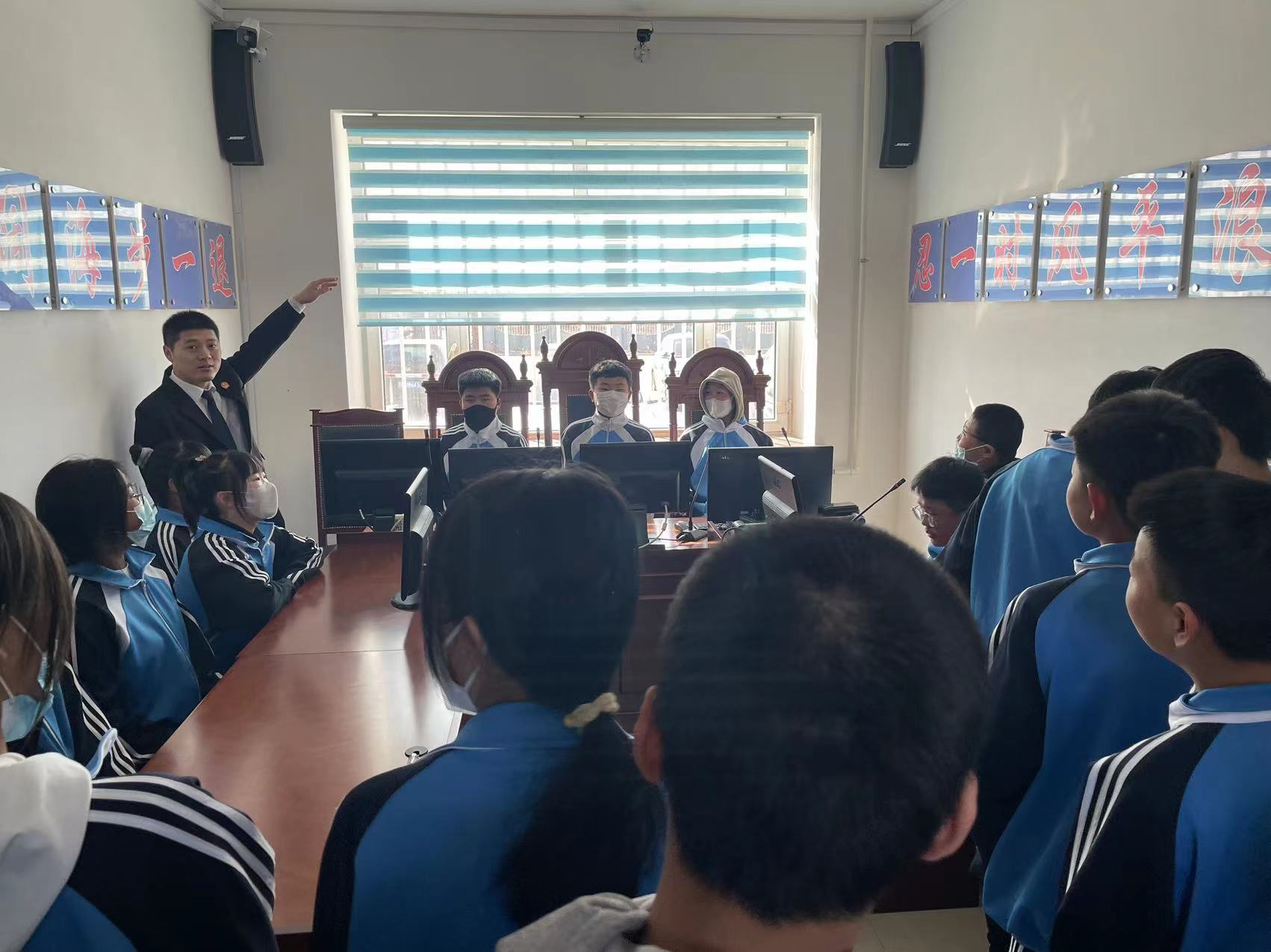 学生首先进入的是祥富法庭的审判庭,在这里,祥富法庭法官助理、祥富中学法治副校长孟伟东邀请学生们轮流落座体验了法庭的庄严和神圣,他为学生们讲解了庭审功能区和庭审的大概流程,并叮嘱无论如何不能触碰法律的底线。